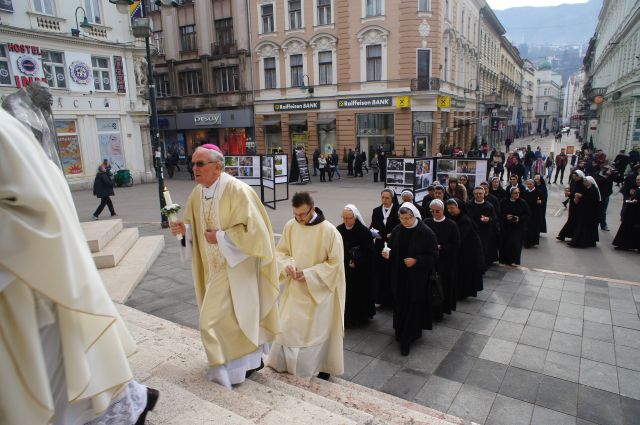 Proslava Dana posvećenog života na kraju Godine posvećenog života započela je uoči blagdana Svijećnice – Prikazanja Gospodinova u ponedjeljak 1. veljače 2016. u katedrali Presvetog Srca Isusova u Sarajevu klanjanjem Presvetom oltarskom sakramentu i molitvom Večernje s početkom u 17 sati koje su animiraju fra Slavko Topić, OFM i bogoslovi Franjevačke provincije Bosne Srebrene. u organizaciji Vijeća za redovništvo Vrhbosanske nadbiskupije. Euharistijsko klanjanje i molitvu Večernje animirali su fra Slavko Topić, OFM i bogoslovi Franjevačke provincije Bosne Srebrene.