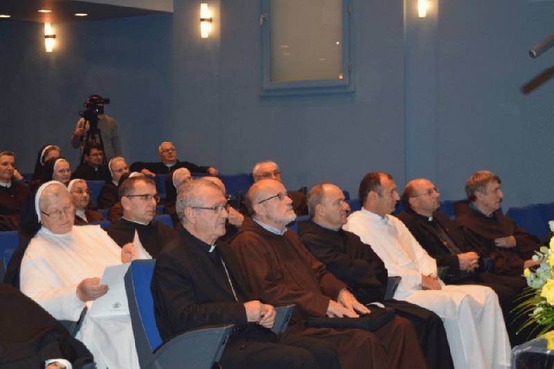 Pozdravljajući okupljene, predsjednik HKVRPP fra Jure Šarčević, OFMCap. je podsjetio na organiziranje redovništva. Potaknuti duhom Drugoga vatikanskog sabora i pozivom Crkve, osobito koncilskim dekretom Perfectae caritatis, na obnovu posvećenoga života radi nove evangelizacije svijeta i autentičnijega života, Bogu posvećene osobe u bivšoj jugoslavenskoj državi organizirale su se u odvojenu redovničku Konferenciju (prvotno: Vijeće) i Uniju. I to je bio jedan od prvih vidljivih plodova obnove na razini strukture, pri čemu mi, unatoč različitim objektivnim poteškoćama koje su nas okruživale, nismo puno zaostajali za drugim slobodnim zemljama. Konferencija, u oba svoja krila, dala je velik i nemjerljiv doprinos postkoncilskoj obnovi hrvatskoga redovništva, a preko njega i cijele Crkve u našem narodu. Teško je uopće i zamisliti obnovu Crkve bez svega onoga što su učinile pojedine družbe i redovi u proteklih pedeset godina. Pedeset godina je iza nas, iza plodnog rada naše danas zajedničke Konferencije. Pedeset godina zbližavanja redovničkih zajednica, pedeset godina suradnje i traženja odgovora na brojna pitanja i izazove koji u ovo današnje vrijeme nisu ništa manji, nego što su bili ranije. Dapače, možda su još veći. Uvjeren sam da ćemo, uz Božju pomoć, još boljom suradnjom i zajedništvom s pastirima naše Crkve, pronaći prave odgovore na njih, rekao je fra Šarčević, te izrazio radost što u ovoj prigodi može biti predstavljena monografija „Zlatni jubilej naše Konferencije", koja na jezgrovit način predstavlja početke, razvoj i stanje života i djelovanja redovništva na ovim našim prostorima u postkoncilskom razdoblju.