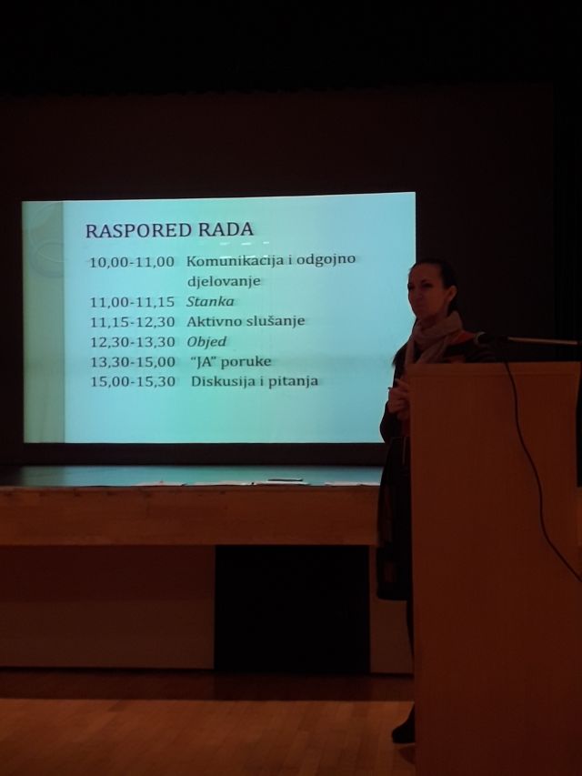 U tijeku izlaganja prof. Sandra je više puta naglasila važnost procesa učenja bolje komunikacije koja nam onda pomaže u našim svakodnevnim kontaktima s djecom i odraslima. Komunikacija stvara značenje i ona je sveprisutna i onda kad nam se čini da ne komuniciramo. I ne komuniciranje i šutnja je zapravo komunikacija. Ona je toliko složena i ona je zapravo stvar odnosa među ljudima. Dotakli smo temu komunikacije s roditeljima djece koju odgajamo te jasno detektirali poteškoće koje imamo, kao i mogućnosti koje možemo iskoristiti na obostrano zadovoljstvo. U popodnevnim satima imali smo priliku čuti još puno poticajnih misli o tome kako slušati da bi nam se dijete obraćalo i kako govoriti da bi nas dijete slušalo. Zanimljiva i osvježavajuća bila nam je vježba „Ja“ poruke – u kojoj smo aktualizirali neka naša svakodnevna ponašanja i pokušali pronaći nova i djelotvornija, koja istina zahtijevaju puno strpljivosti i ustrajnosti, ali su u svakom slučaju sretnija.