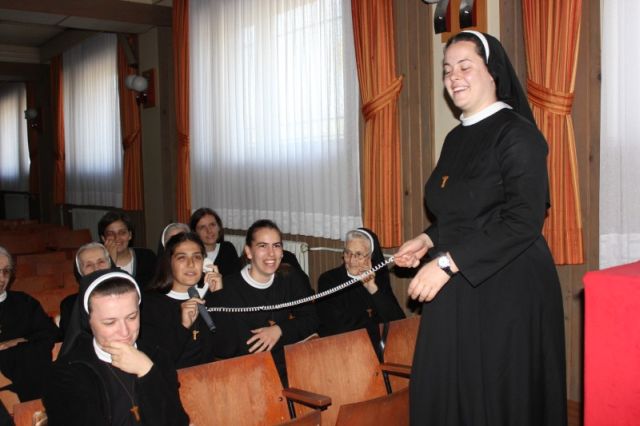 Nakon objeda u samostanskom blagovalištu i ugodnih razgovora i druženja sestara, u popodnevnim satima svojim duhovno-rekreativnim programom sestre su u dvorani dočekale sestre juniorke. Povodom 150. obljetnice osnutka Družbe i proslave Godine jubileja upriličile su „tv-emisiju“, ali iz onostrane perspektive. Majka Angelica (s. Ivana Džeba) u svom je nebeskom studiju ugostila utemeljiteljicu Družbe Majku Margaritu (s. Anica Orlović) i s njom zapodjenula razgovor o početcima Družbe, razlozima i nadahnućima, radostima i poteškoćama koje su pratile ostvarenje poticaja i potrebe da se učini nešto za siromašnu i zapuštenu djecu. U emisiju su se „uključile“ i sestre gledateljice i postavljale pitanja, od onih ozbiljnih do običnih, svagdanjih… A „glumice“ su sve iznenadile lakoćom komunikacije, dobro svladanim gradivom iz povijesti Družbe, mudrošću odgovora i snalaženja, dozom humora koji su na pravome mjestu znale dodati ozbiljnom tonu emisije. Za kraj su ispraćene dugim pljeskom, a sestre juniorke obdarile su sestre na kraju i jednim glazbenim brojem.