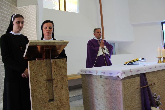 Nakon poticajnih riječi s. Klare, koje su sestre potaknule na razmišljanje i ispit savjesti, središte i vrhunac susreta proslavile su sestre u samostanskoj kapelici Krista Kralja na euharistijskom slavlju u 12 sati koje je predslavio don Ivica Žižić, svećenik Splitsko-makarske nadbiskupije i profesor na KBF-u Sveučilišta u Splitu. Predslavitelj se u svojoj homiliji osvrnuo na gostoprimstvo povezano s evanđeljem o farizeju Šimunu koji je ugostio Isusa i ženi grešnici (Lk 7, 36-50). Don Ivica je ukazao na Isusov primjer gosta i tuđinca koji se nije ustručavao blagovati s nepoznatima, nije patio od predrasuda koje su ljudi imali prema njemu a iste najčešće guše i naše odnose. Isus nam je i u ovom ulomku podastro stol ljubavi žene grešnice iznad onoga stola Zakona koji je opsluživao farizej Šimun. Sveto misno slavlje animirale su sestre pod ravnanjem s. Ružice Marijić i glazbenu pratnju s. Ivane Džambas.