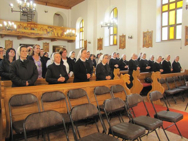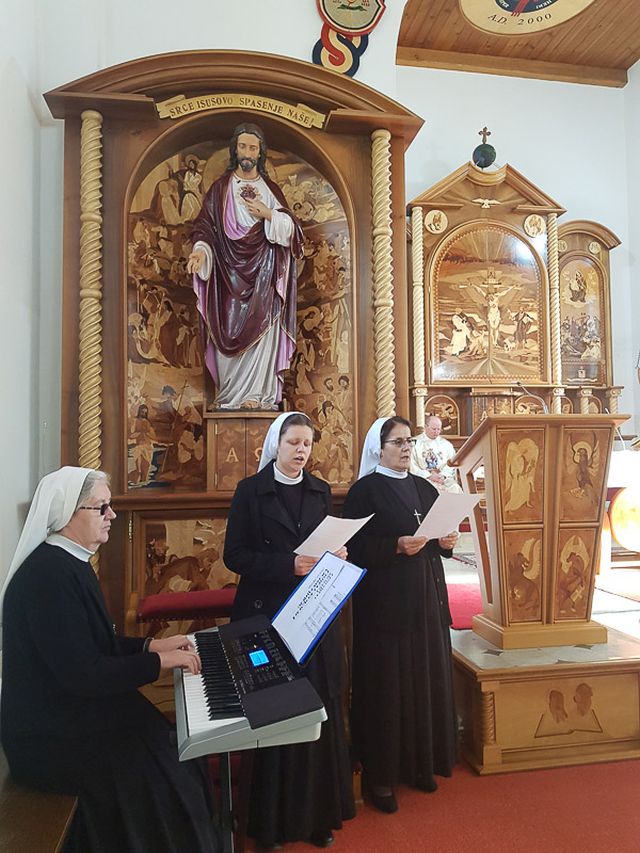 S pjesmom i u procesiji sestre su ušle u crkvu gdje je misno slavlje s početkom u 11 sati slavio vlč. Josip Knežević. U svojoj homiliji istaknuo je da je svemogući Bog od milijune načina da ostvari plan spasenja odabrao majčinstvo naše Divne Majke. Ona je izgovorila svoj „evo me“ koji se izgovara samo onda kad smo potpuno sigurni u svoju odluku. I taj „evo me“ Marija je živjela cijelog svog života, to iščekivanje da postane majkom živjela je u skrovitosti i molitvi. Vlč. Knežević je također kazao da su redovnice, pozvane živjeti duhovno majčinstvo i stvarati Božje obitelji od svojih zajednica i da u Mariji trebaju imati uzor, biti s njom povezane u molitvi kako bi začele Isusa u svom srcu i porodile ga u svom življenju.