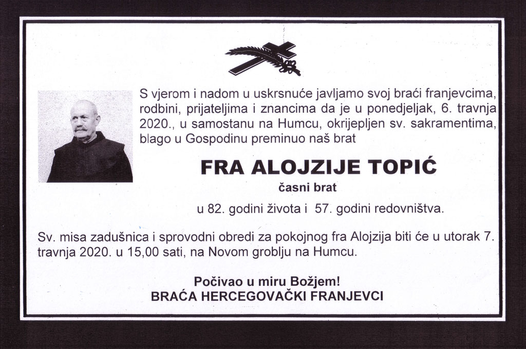 U ponedjeljak, 6. travnja 2020., u samostanu na Humcu, okrijepljen sv. sakramentima, blago u Gospodinu preminuo je fra Alojzije Topić u 82. godini života i 57. godini redovništva.