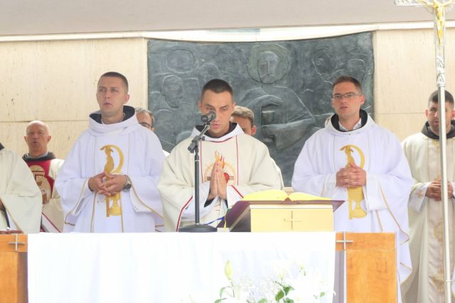 Svečanu svetu misu u 11 sati, predvodio je mladomisnik fra Zoran Topalović, a koncelebrirali su slavljenici fra Zdenko i fra Fabio, kolege mladomisnici Franjevačke provincije Bosne Srebrene, fra Velimir Bavrka mjesni župnik, fra Drago Pranješ gvardijan gučogorskog samostana te drugi svećenici.