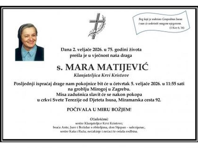 U ponedjeljak 2. veljače 2026., u 75. godini života preminula je s. Mara Matijević, članica Klanjateljica Krvi Kristove Regije Zagreb.
