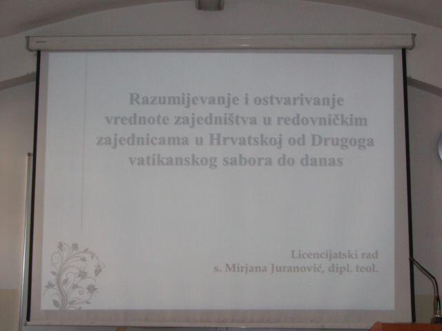 Dana 14. travnja, na Katoličkom bogoslovnom fakultetu u Zagrebu s. Mirjana Juranović uspješno je obranila licencijatski rad na temu U Povjerenstvu za obranu rada bili su: prof. dr. sc. Tonči Matulić (predsjednik), prof. dr. sc. Stjepan Baloban (mentor – član), doc. dr. sc. Franjo Podgorelec (član). Javnoj obrani, uz nekolicinu njezinih kolega i prijatelja, nazočila je regionalna poglavarica s. Ana Marija Antolović i još desetak Klanjateljica.